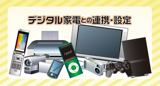 私達の生活には、一般家電製品同様、デジタル家電が入り込んできています。当社ではサポート業務の一環として、PCとデジタル家電との連携やデジタル家電のインターネット接続、あるいはデジタル家電そのものの設定を承っております。
