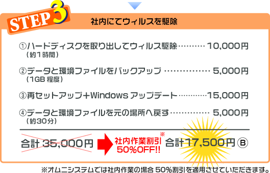お客様のご自宅での完全な駆除作業は不可能です。必ず引き上げ修理にて対応させていただきます。ウイルス駆除と関連ファイルの削除をした後、複数回の起動テストを行います。少しでも問題を見付けた場合はお客様の許可を得た上で、データをバックアップし、全てを初期状態に戻します。